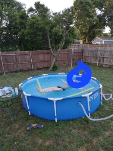 I'm still trying to figure out the proper way to balance pool chemicals. So far we just have a floaty thing with dissolving chlorine tablets inside. According to the pH strip style testing strips, everything has been pretty balanced, but I imagine we'll have to do the "pool shock" soon. Will need to read up on that. Also, the pool has gotten a lot of dirt on the bottom and no matter how long we run the filter it doesn't clean it. We just ordered a pool vacuum to see if it will do the trick. The filter that comes with this pool isn't strong enough to create suction for the vacuum, so we ordered a different style that you connect to your hose.