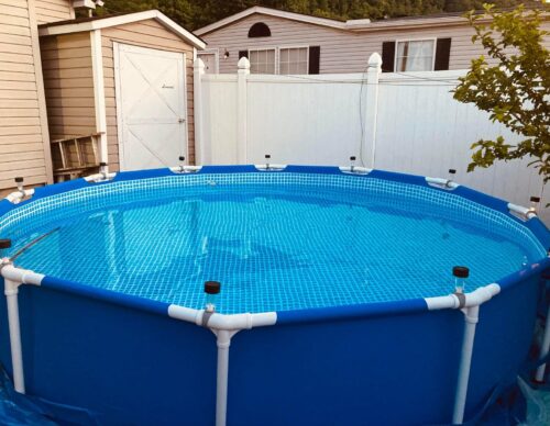 We stretched out the liner and let the sun heat it up so that we could stretch out the wrinkles more easily. Then we inserted the top poles, and medal connectors around the liner until we reached our starting point. Make sure you even center them. If you get to the end and you just can get the last elbow in, work together to go around to ensure each piece is centered. One person hold the liner while the other wiggles and slightly twists the pole to make sure it is centered.