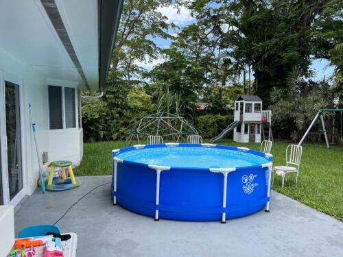 Pool with pump, net, vacuum, cover, and tablets and I’m under $300. I will have to eventually buy more tablets and I’m considering getting the 1000 gph pump with skimmer but this thing is so low maintenance I’d be doing more out of intrigue. Plus the skimmer hangs on the edge and takes pool space away. We’ll see. Fun easy little project, kids love it, 4 adults fit easy, low maintenance.
