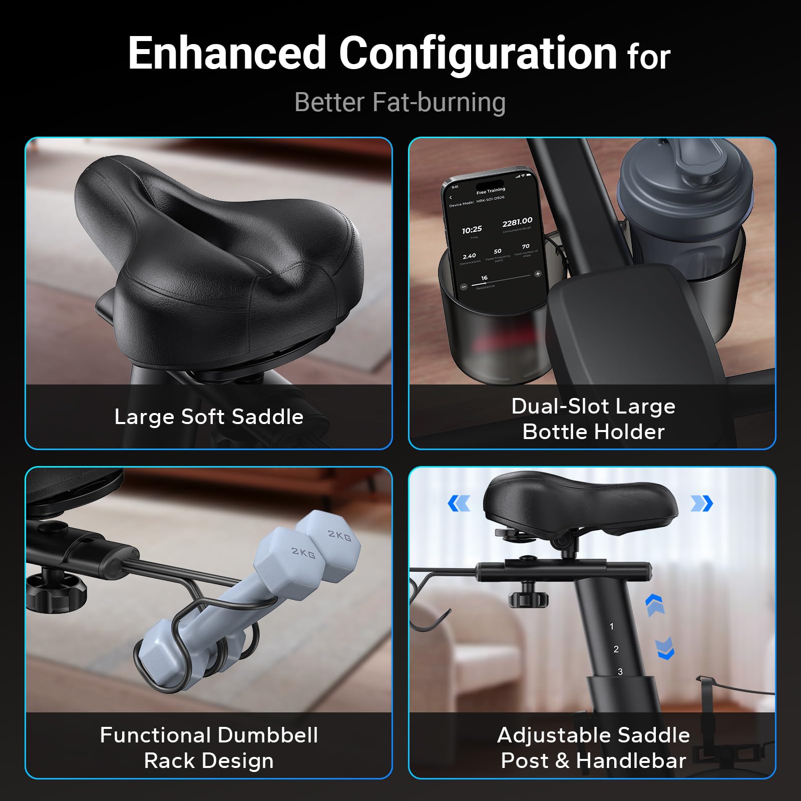 - Stable Frame – Dual-triangle stainless steel construction supports up to 300 lbs and prevents wobble during intense cycling.