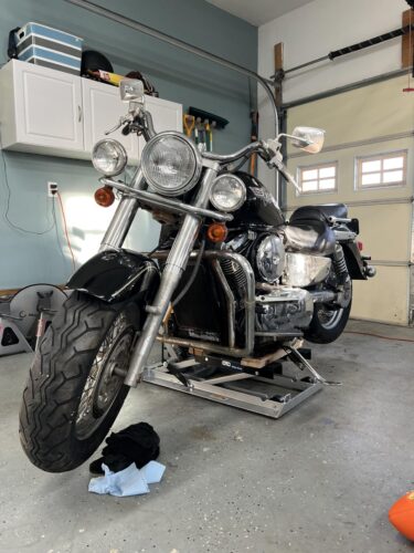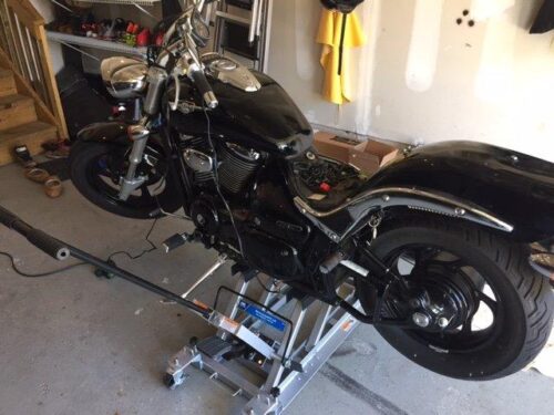 Now be careful with the straps though! The straps anchor to the base of the jack, so if you strap down the bike tightly and later decide to lift the bike some more, you will be putting a ton of force on those straps and could break them or something on your motorcycle.