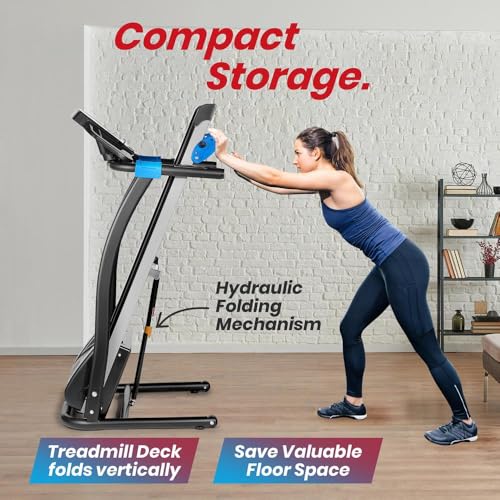 One of the standout features of this treadmill is its hydraulic folding system. After your workout, simply fold it up, and it stores away easily with minimal effort. With compact dimensions of just 21.65" L x 24.4" W x 46.4" H when folded, it’s a great choice for those who are limited on space but still want the benefits of a treadmill. Whether you’re living in a small apartment or just need to save room when not in use, this feature makes it a perfect solution.