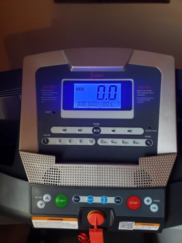 After I let it run for a minute to oil the mat up, I was ready to roll! There is an on switch on the bottom front of the device, and from there the controls light up. The handles do have the up/down for incline on the left and the up/down for speed on the right. They also have a pulse reader on the handles, but I don't find it works well at all, and sometimes I get a little static shock on the left handle as an FYI. The face of the device has your start and stop, your time, quick buttons for speed in two increments (2 mph, 4, 6, 8 mph), has incline quick buttons, and music buttons on top that I don't use at all. There is also a magnetized latch that magnetizes in the middle of the treadmill at the bottom, and the clamp goes on you just in case you fall. The magnet is wrenched off, and it does stop immediately!