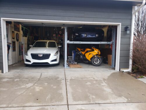 - I can get both cars in without the garage tracks being modified and I think this is mostly the case for lower-profiled cars. I will be installing the garage rails kit so I can open the garage door fully instead of halfway to slide in the bottom car. I did remove the mechanical garage lift and guide rail so I can lift any car to the 10'10" ceiling. I now lift the single-car garage door manually until I install the solution. Both SUV's fit easily without spacing issues through the double side door where that one is still motorized.